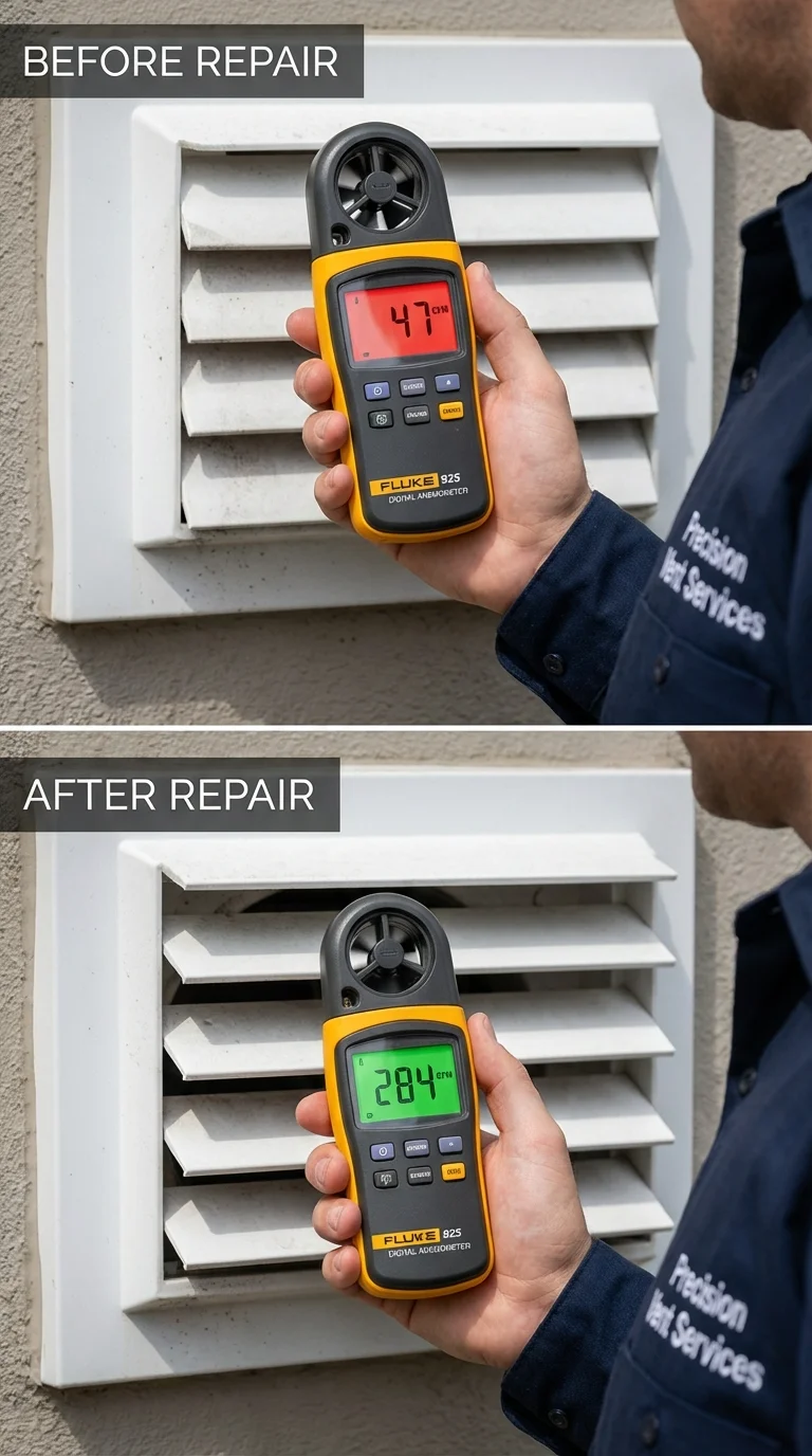 Most homeowners see a 40–80% improvement in airflow performance after a combination cleaning + component repair. Based on field measurement data from Precision Vent Services technicians.